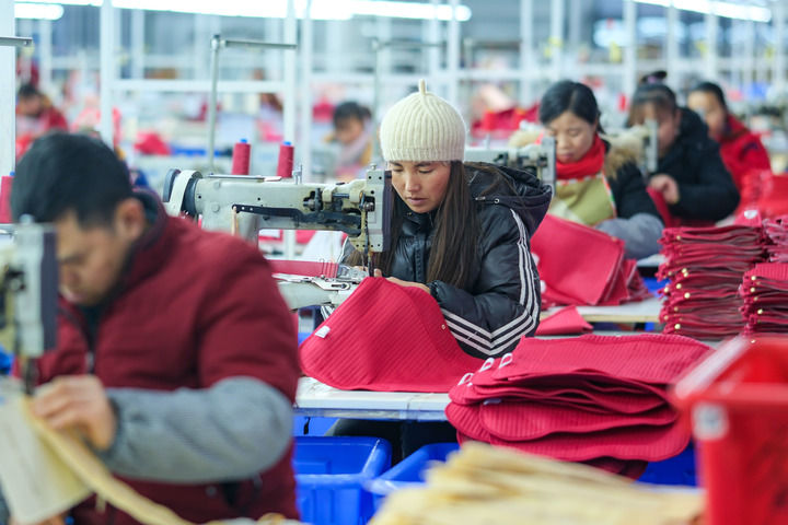 2024年1月18日,社區(qū)居民在紅安社區(qū)的鄉(xiāng)村振興就業(yè)車間工作。紅安社區(qū)是由易地搬遷安置區(qū)單獨(dú)成立的新社區(qū),位于湖南省湘西土家族苗族自治州鳳凰縣禾庫(kù)鎮(zhèn)。新華社記者 張鋮 攝