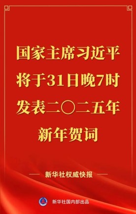 國家主席習(xí)近平將于31日晚7時通過中央廣播電視總臺和互聯(lián)網(wǎng),發(fā)表二〇二五年新年賀詞。中央廣播電視總臺所屬中央電視臺綜合頻道、新聞頻道、中文國際頻道、4K頻道,中國國際電視臺各外語頻道,中央人民廣播電臺,中國國際廣播電臺,以及人民網(wǎng)、新華網(wǎng)、央視新聞客戶端等中央主要新聞媒體所屬網(wǎng)站、新媒體平臺將準(zhǔn)時播出。