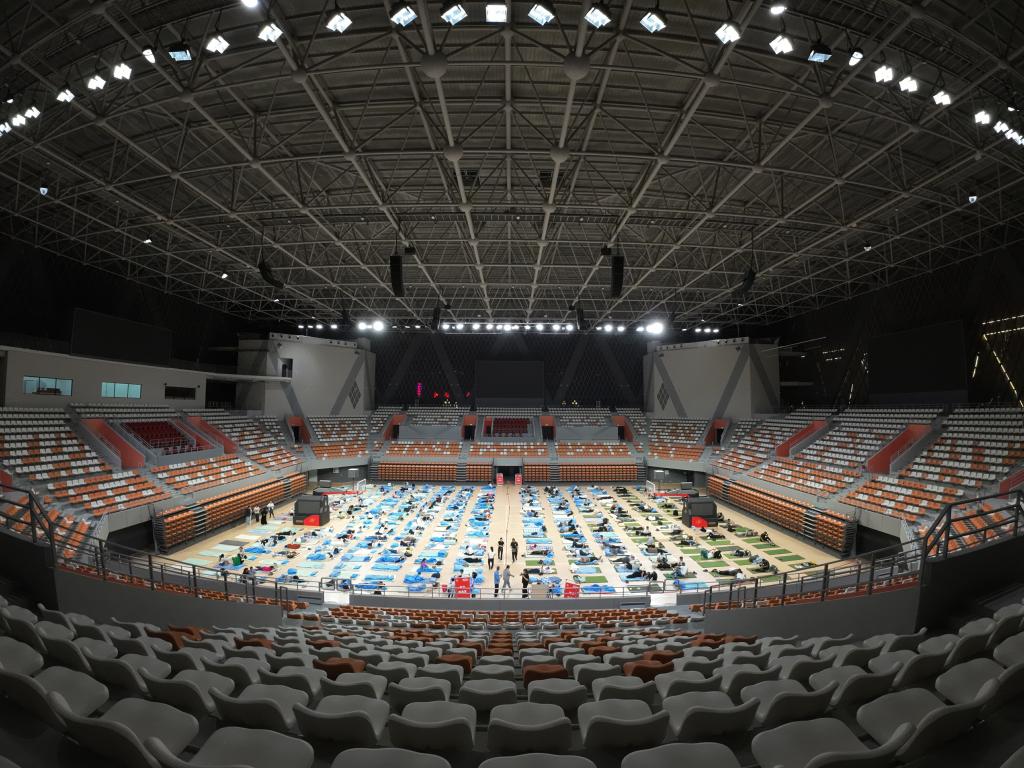 9月6日夜,塔里木大學體育館內,數百名家長準備在此就寢。新生入學之際,該校在學校大型館所安置500張床位,提供給陪同新生報到的家長們。(兵團日報全媒體記者 王志清)