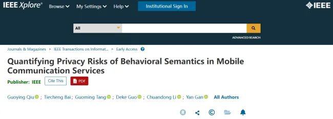 1月25日,塔里木大學新引進博士邱國英在《IEEE Transactions on Information Forensics and Security》發表了題為“Quantifying Privacy Risks of Behavioral Semantics in Mobile Communication Services”的學術論文。該期刊為中國計算機學會推薦的網絡與信息安全領域國際頂級期刊,CCF-A類Trans;同時為中科院SCI一區Top期刊,影響因子6.3。邱國英博士為論文第一作者,白鐵成教授為通訊作者。
