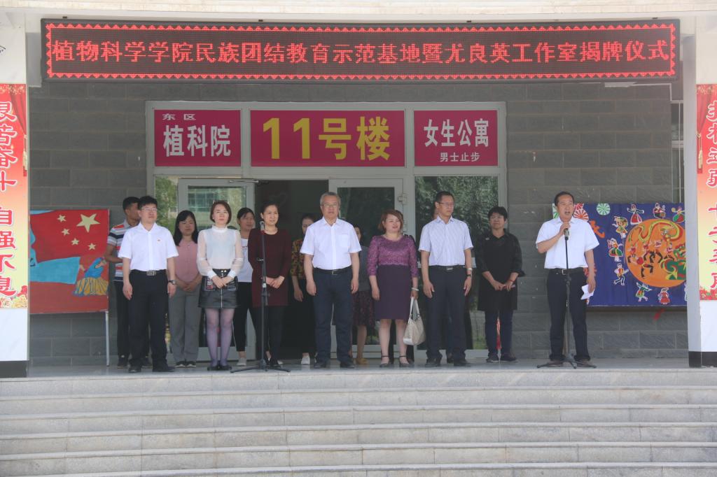 5月29日下午,植物科學(xué)學(xué)院民族團(tuán)結(jié)教育示范基地暨全國人大代表尤良英工作室揭幕儀式舉行。黨委常委、副校長(zhǎng)曲義勇,黨委統(tǒng)戰(zhàn)部部長(zhǎng)阿不都卡迪爾·艾海提,校外輔導(dǎo)員尤良英,學(xué)生工作部部長(zhǎng)孟琪,植科院黨委副書記、院長(zhǎng)萬素梅,學(xué)工部副部長(zhǎng)陳蕾,校團(tuán)委副書記常海亮出席。儀式由植科院黨委書記蔣學(xué)瑋主持,在東區(qū)11號(hào)學(xué)生宿舍樓門口舉行。