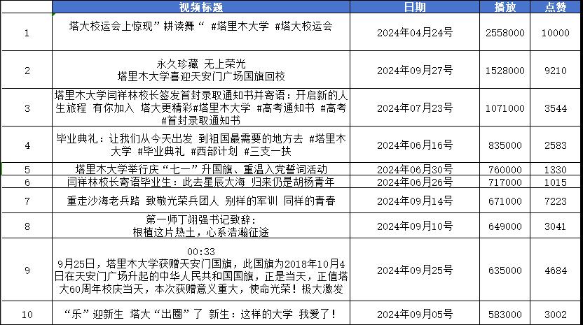 2024年塔里木大學官方抖音最熱前10條視頻數據
