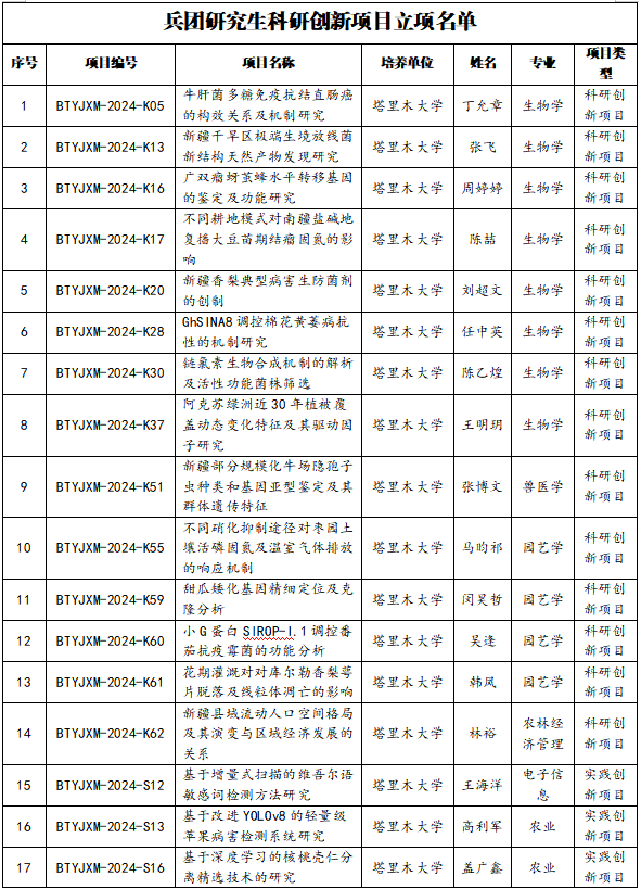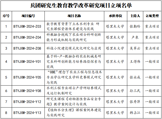 12月25日,兵團教育局公布了2024年兵團研究生教育創新計劃項目立項結果。我校33個項目獲批立項,其中,研究生教育教學改革研究項目立項8項,研究生科研創新項目立項25項。