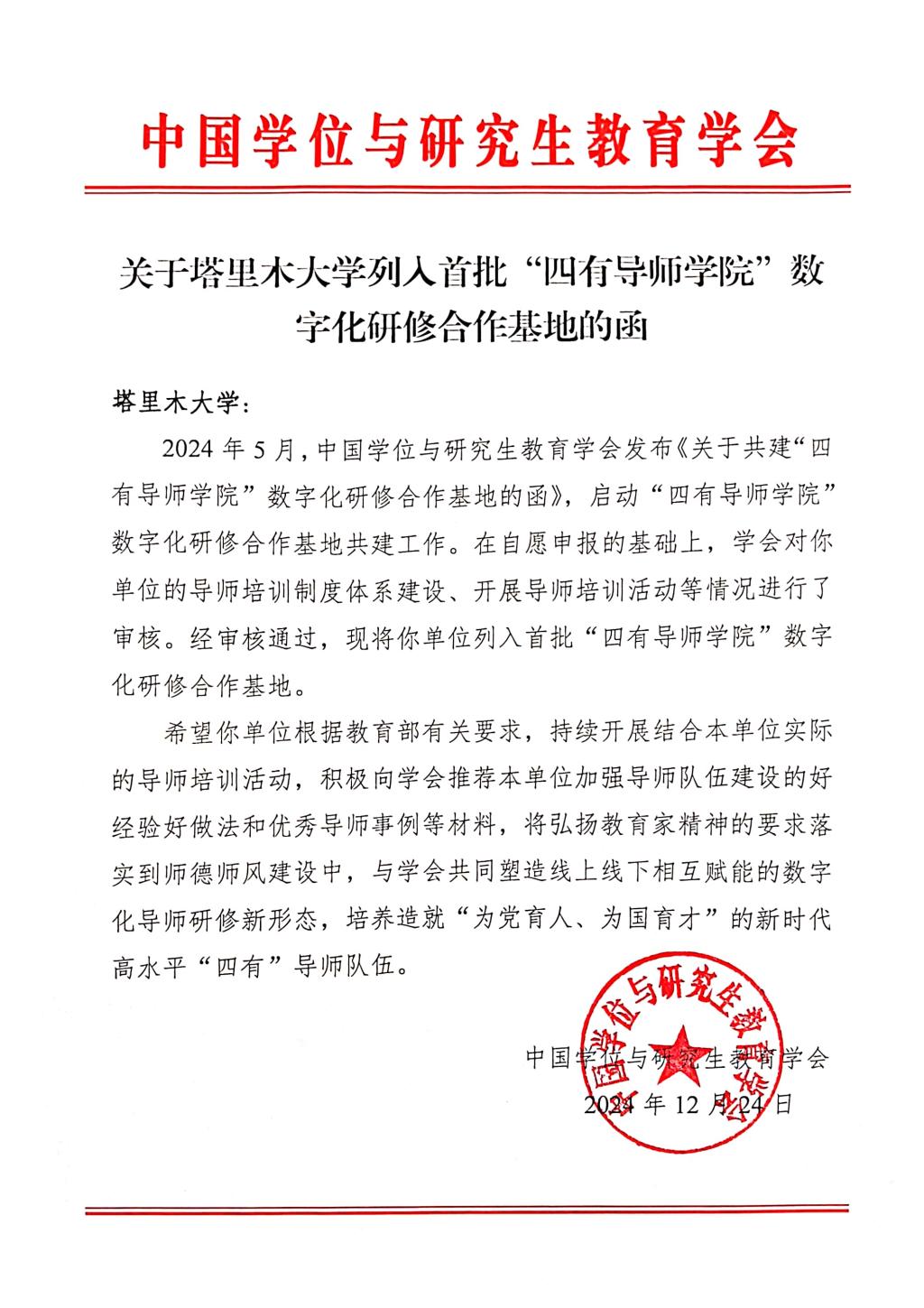 近日,我校收到來自中國學位與研究生教育協會發來的《關于塔里木大學列入首批“四有導師學院”數字化研修合作基地的函》,經審核,我校順利列入首批“四有導師學院”數字化研修合作基地。這標志著學校師資隊伍建設邁上新臺階。