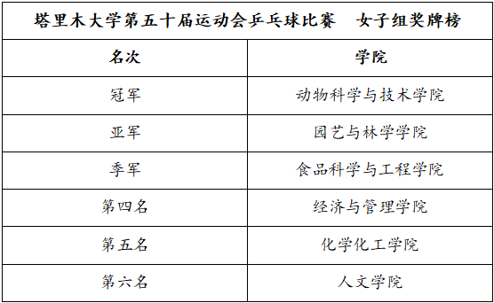 據悉,本次乒乓球比賽作為塔里木大學第五十屆運動會分項賽,分設男子團體賽、女子團體賽兩個項目,吸引了16個學院共828人次參賽。經過276場激烈對抗,最終決出各項冠軍。