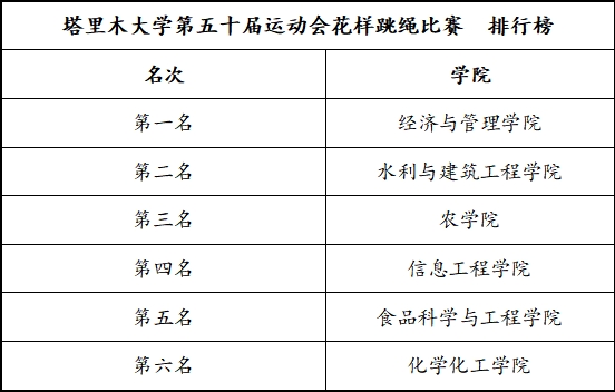 4月19日,塔里木大學第五十屆運動會花樣跳繩比賽在風雨操場圓滿結束。最終,經濟與管理學院獲得花樣跳繩比賽團體冠軍。
