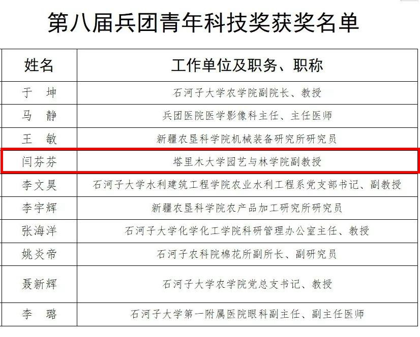 近日,兵團黨委組織部、兵團人力資源和社會保障局、兵團科協、兵團團委聯合印發《關于表彰第八屆兵團青年科技獎獲獎者的決定》,我校園藝與林學學院閆芬芬教授獲得兵團青年科技獎。