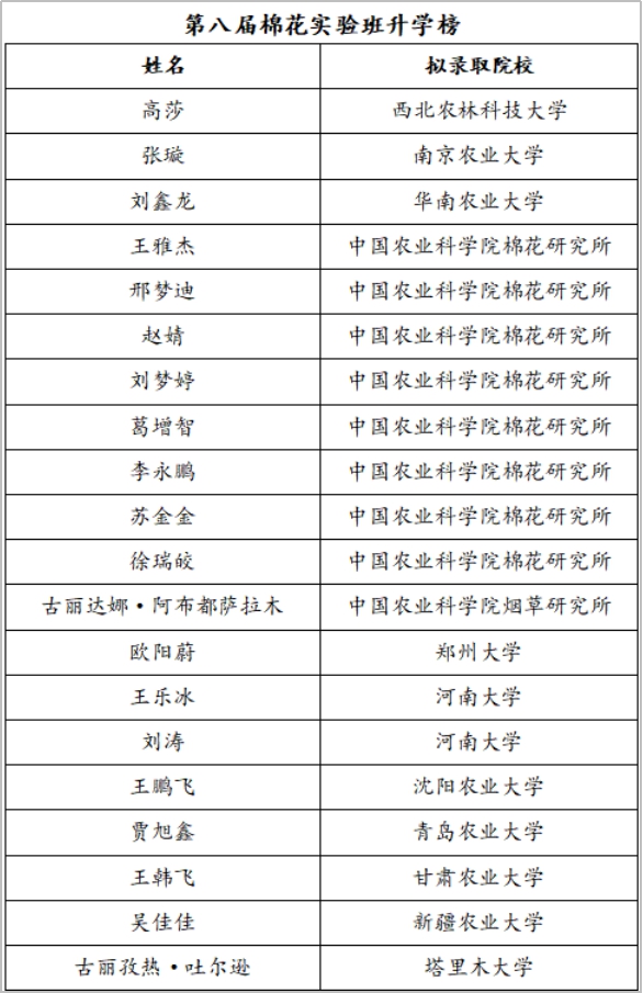 第八屆棉花實驗班由我校與中國農業科學院棉花研究所聯合創辦,依托雙方優勢資源,致力于培養服務國家棉花產業的高層次科技人才。班級立足新疆棉花產業需求,面向中亞棉花發展戰略,構建了學科交叉、實踐導向的特色培養體系。現有農學、植物保護、生物技術等8個專業的33名優秀學子,其中男生12人,女生21人。