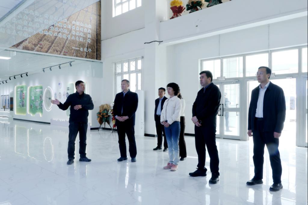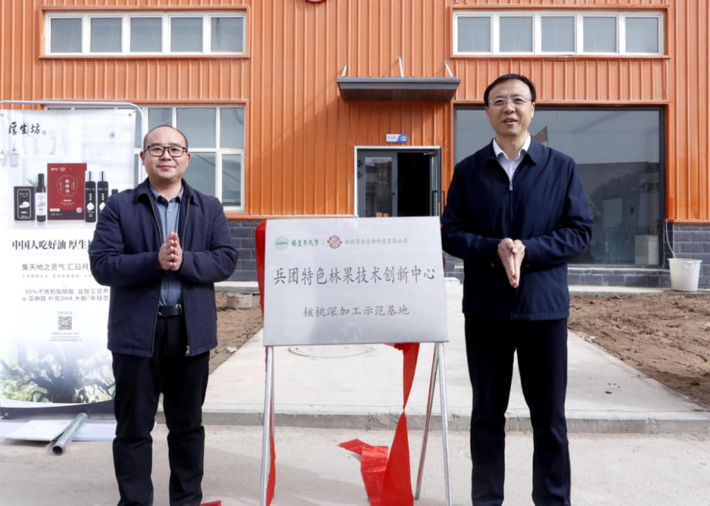 校領導來到新疆厚生生物科技有限公司調研,受到強佑集團副總經理、厚生工廠板塊負責人牛立軍,新疆厚生生物科技有限公司廠長杜建熱情接待。王成濤、杜建為“核桃深加工示范基地”揭牌。