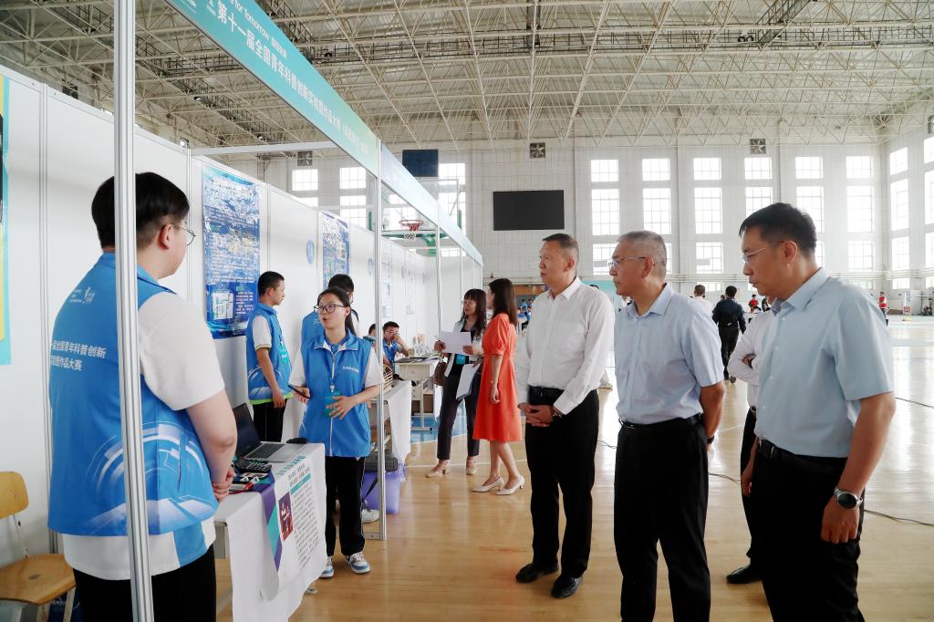 開幕式后,全體參賽選手在風(fēng)雨操場(chǎng)進(jìn)行“創(chuàng)意作品”和“未來太空車”分賽道比賽,與會(huì)領(lǐng)導(dǎo)、評(píng)委專家來到比賽現(xiàn)場(chǎng)指導(dǎo)。