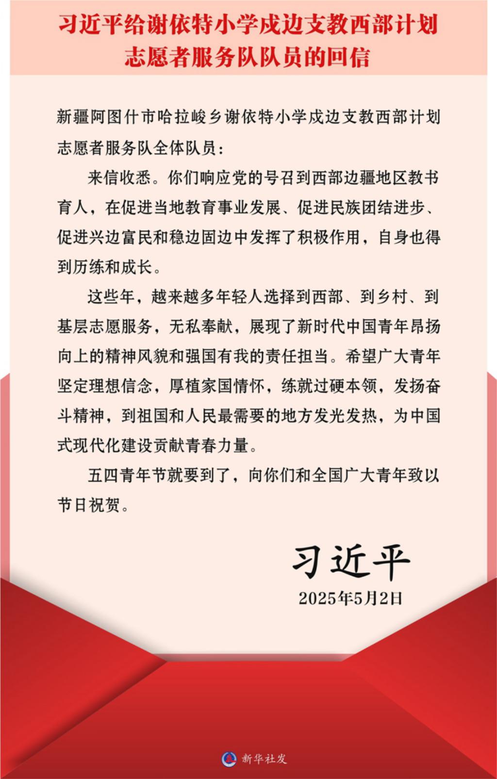 新華社北京5月3日電?在五四青年節到來之際,中共中央總書記、國家主席、中央軍委主席習近平給新疆克孜勒蘇柯爾克孜自治州阿圖什市哈拉峻鄉謝依特小學戍邊支教西部計劃志愿者服務隊全體隊員回信,向全國廣大青年致以節日祝賀并提出殷切期望。