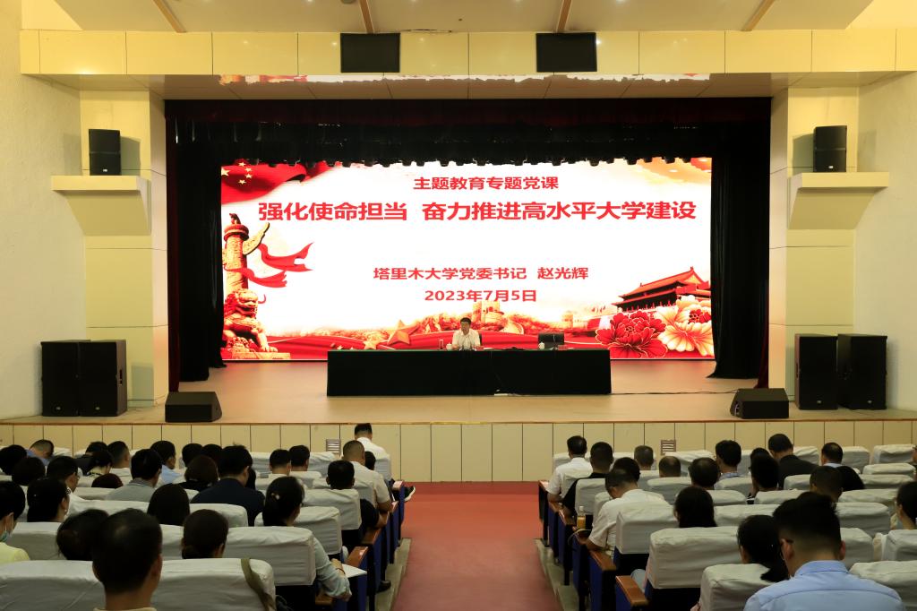 趙光輝首先傳達學習了李邑飛同志為兵團機關部門、直屬機構和有關國有企業(yè)黨員干部講授學習貫徹習近平新時代中國特色社會主義思想主題教育專題黨課的主要內容。他圍繞塔里木大學建校以來的“三個不平凡”;新時期黨和國家賦予塔大的光榮使命和重大任務;五年來銳意進取、攻堅克難,取得的歷史性成就;新征程上塔大面臨的新機遇和新挑戰(zhàn);繼續(xù)發(fā)揚胡楊精神,為實現(xiàn)兵團特點、南疆特色一流大學而奮斗這五個方面進行了全面深入的講解。